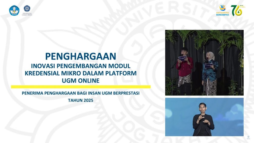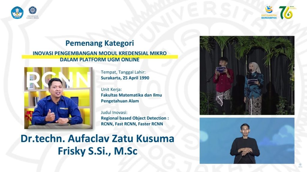 Penghargaan tersebut diberikan atas karya inovatif berjudul “Regional Based Object Detection: RCNN, Fast RCNN, Faster RCNN”, yang dikembangkan sebagai modul pembelajaran kredensial mikro berbasis platform UGM Online. Modul ini dirancang untuk memperkuat pemahaman terhadap teknologi deteksi objek, salah satu topik dalam bidang pemrosesan citra berbasis kecerdasan buatan.