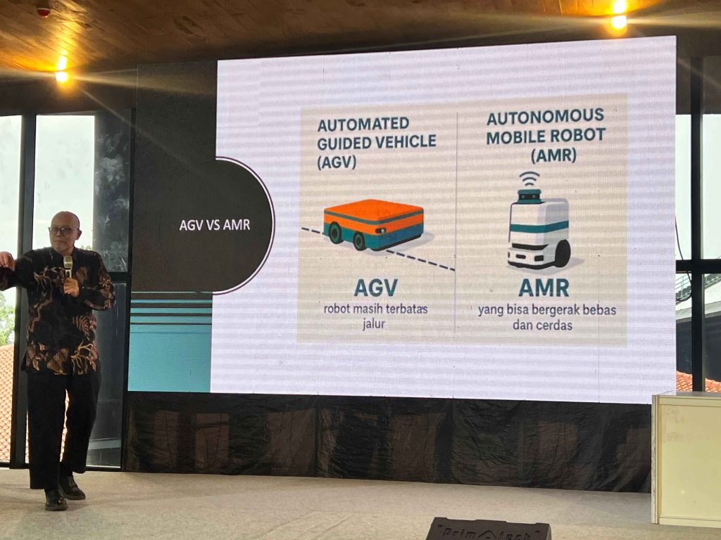 Prof. Jazi Eko Istiyanto kemudian memaparkan riset terkini mengenai Autonomous Mobile Robot (AMR) yang menjadi fokus Laboratorium Sistem Tertanam dan Robotika. Ia menjelaskan bahwa berbeda dengan Automated Guided Vehicle (AGV) yang bergantung pada jalur khusus, AMR dapat bernavigasi secara mandiri. Hal ini dimungkinkan berkat teknologi Simultaneous Localization and Mapping (SLAM), sensor LiDAR, kamera stereo, serta sistem komunikasi antar-robot. Dengan kemampuan tersebut, AMR dapat dimanfaatkan untuk berbagai aplikasi, mulai dari robot pengantar barang hingga kursi roda otonom bagi penyandang disabilitas.