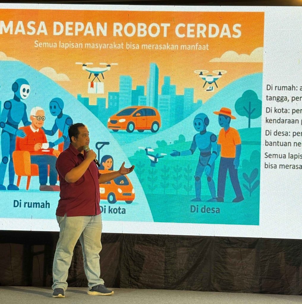 Dalam pemaparannya, Dr. Andi Dharmawan menjelaskan konsep robot cerdas sebagai mesin yang mampu melihat, berpikir, belajar, dan mengambil keputusan secara mandiri. Menurutnya, robot saat ini tidak lagi terbatas untuk kebutuhan industri, melainkan hadir dalam kehidupan sehari-hari, mulai dari robot vacuum, mobil otonom, hingga robot asisten lansia. “Robot bukan hanya untuk ilmuwan atau insinyur, tetapi juga untuk petani dengan robot pertanian, penyandang disabilitas dengan kursi roda otonom, hingga anak-anak sekolah yang belajar membuat robot sederhana,” ujarnya.