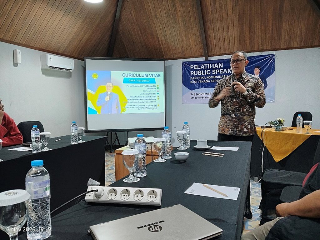 Pelatihan menghadirkan narasumber Jack Haryanto, seorang MC profesional sekaligus Koordinator Bidang Protokol UGM, yang membagikan pengalaman dan teknik berbicara di depan umum secara praktis. “Berbicara di depan umum bukan sekadar menyampaikan kata-kata, tetapi juga menyampaikan pesan dengan tujuan menginspirasi, mendidik, dan memotivasi,” ujar Jack dalam salah satu sesi. Peserta diajak berlatih mengelola rasa gugup, menggunakan intonasi dengan tepat, menjaga kontak mata, hingga memahami bahasa tubuh yang efektif.