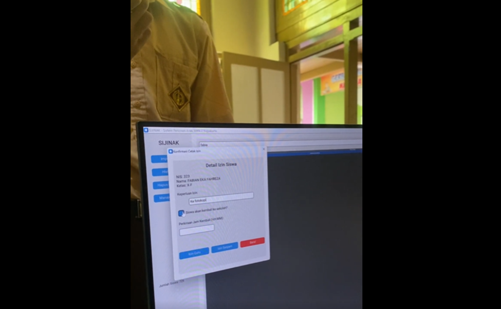 Sistem smart monitoring yang dikembangkan mencakup berbagai komponen terintegrasi, seperti aplikasi desktop untuk pengelolaan izin, face recognition HIKVISION untuk identifikasi otomatis, automated printing system untuk tiket perizinan, hingga arsip digital dan verifikasi otomatis saat siswa kembali. Dalam alur penggunaannya, siswa mengajukan izin melalui guru piket, sistem mengenali wajah secara otomatis, tiket izin dicetak dan disahkan, kemudian saat siswa kembali, sistem melakukan verifikasi ulang tanpa perlu pelaporan manual.