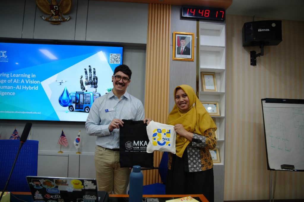 Yogyakarta, 26 September 2025 – Program Studi Magister Kecerdasan Artifisial (MKA), Departemen Ilmu Komputer dan Elektronika (DIKE) FMIPA UGM, menyelenggarakan DCSEminar dengan topik “Assuring Learning in the Age of AI: A Vision for Human-AI Hybrid Intelligence.” Seminar ini menghadirkan Dr. Eduardo Araujo Oliveira, Senior Lecturer di School of Computing and Information Systems, the University of Melbourne, Australia, yang telah lama meneliti penerapan kecerdasan buatan (AI) dalam dunia pendidikan tinggi.
