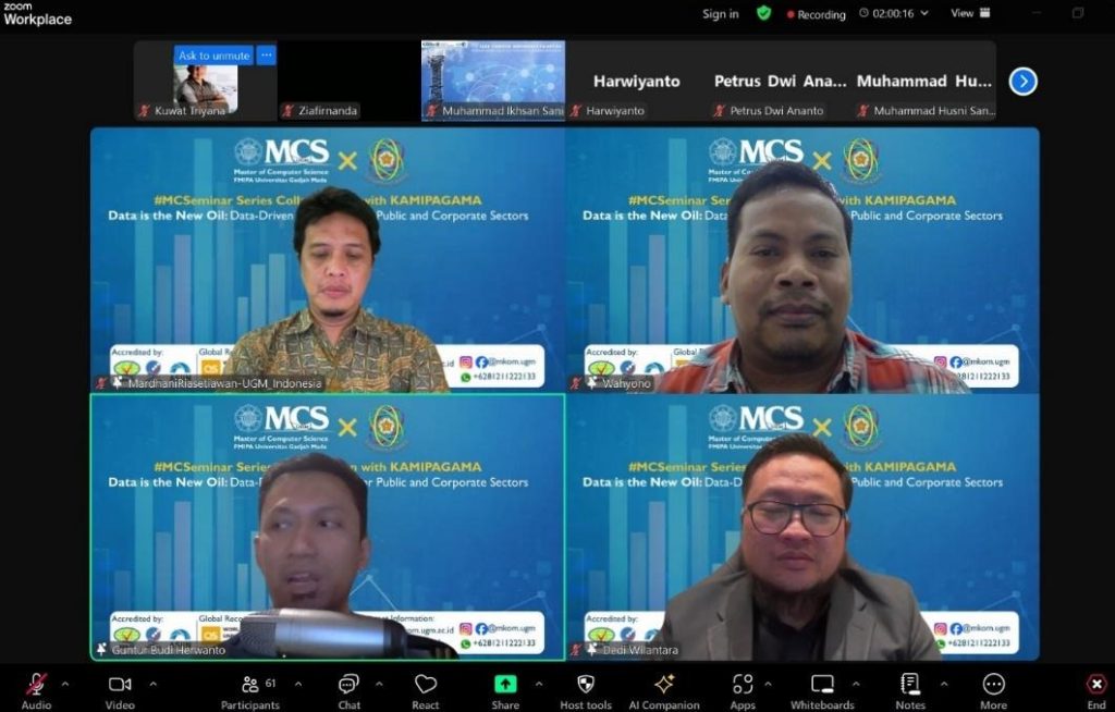 Yogyakarta, 6 Februari 2026 – Program Studi Master of Computer Science (MCS), Departemen Ilmu Komputer dan Elektronika (DIKE), FMIPA Universitas Gadjah Mada bekerja sama dengan KAMIPAGAMA kembali menyelenggarakan MCSeminar Series bertajuk “Data is the New Oil: Data-Driven Innovation for Public and Corporate Sectors.” Kegiatan ini dilaksanakan secara daring dan diikuti oleh profesional sektor publik, pelaku industri, alumni, mahasiswa, serta calon mahasiswa MCS UGM dari berbagai daerah.